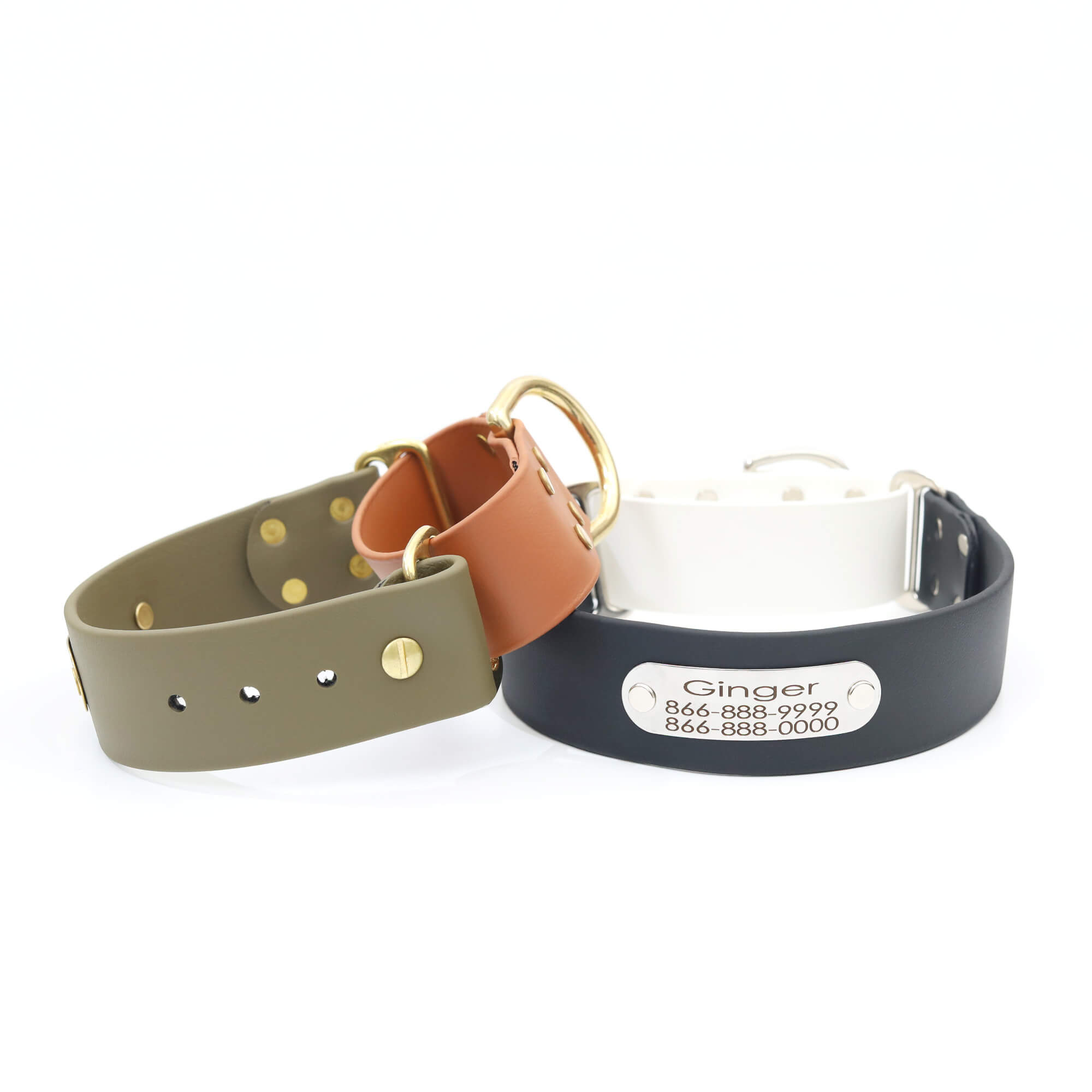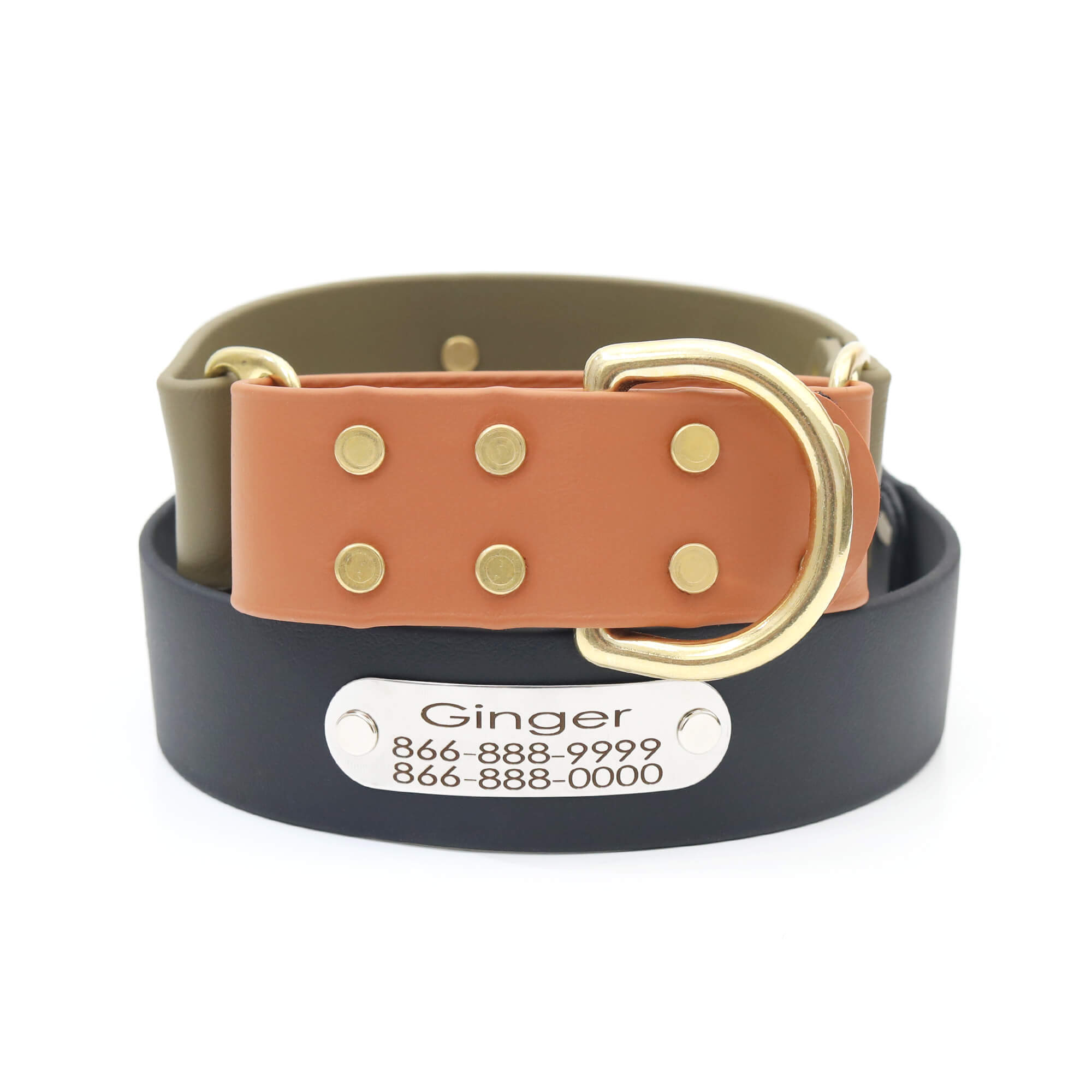 Adding a personalized nameplate just makes them that much better! Our laser engraved nameplate eliminates the need for tags and the jingle jangle that comes along with them. Plus, this personalized dog collar can include your number, address, microchip number or a combo of the three!