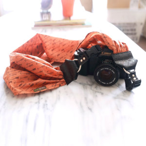 Scarf camera straps are all the rage and for good reason! Combining a sturdy strap with a piece to compliment your outfit is a win/win! Our Arrow strap has tiny black arrows on a muted orange fabric. Its neutral, super cool and unisex!
