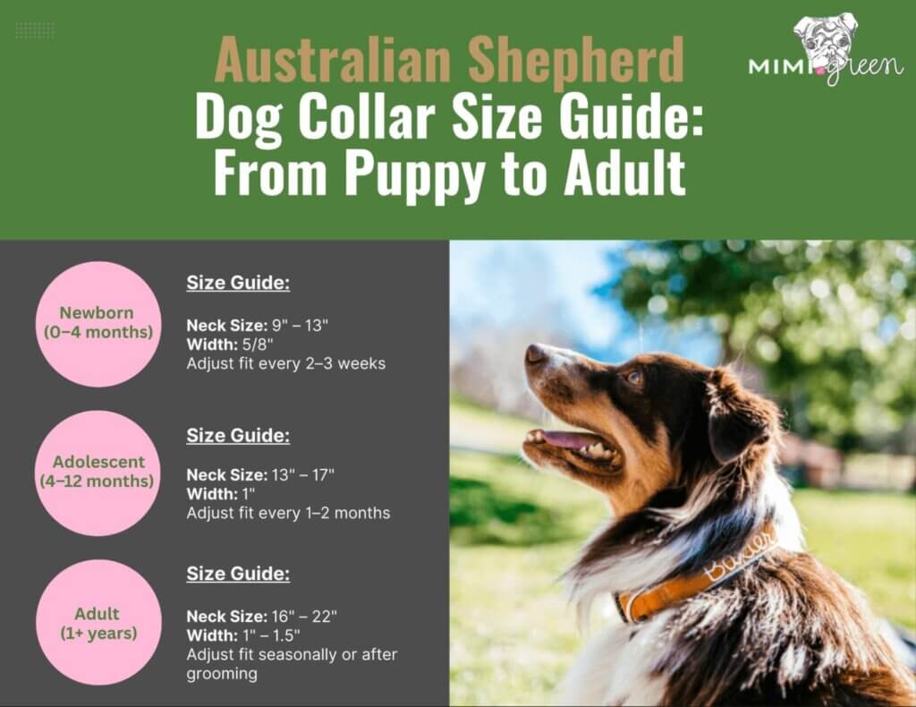 - What size collar for an 8-week-old Aussie? Start with a lightweight, adjustable style that can grow with them. Biothane or soft nylon works great for new pups.