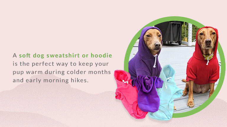 - Dog hoodie: A soft dog sweatshirt or hoodie is the perfect way to keep your pup warm during colder months and early morning hikes. Just be sure to monitor them for signs of overheating, as they may work up a sweat throughout the walk. If you plan to hike frequently, consider investing in a raincoat for your dog so you’re not limited by the weather forecast.