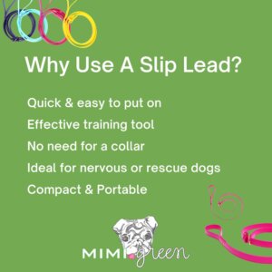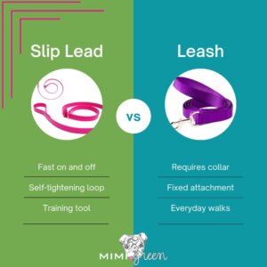 A slip lead is a single piece of rope or nylon with a loop on one end that goes around the dog’s neck and tightens with tension. It doesn’t require a separate collar.