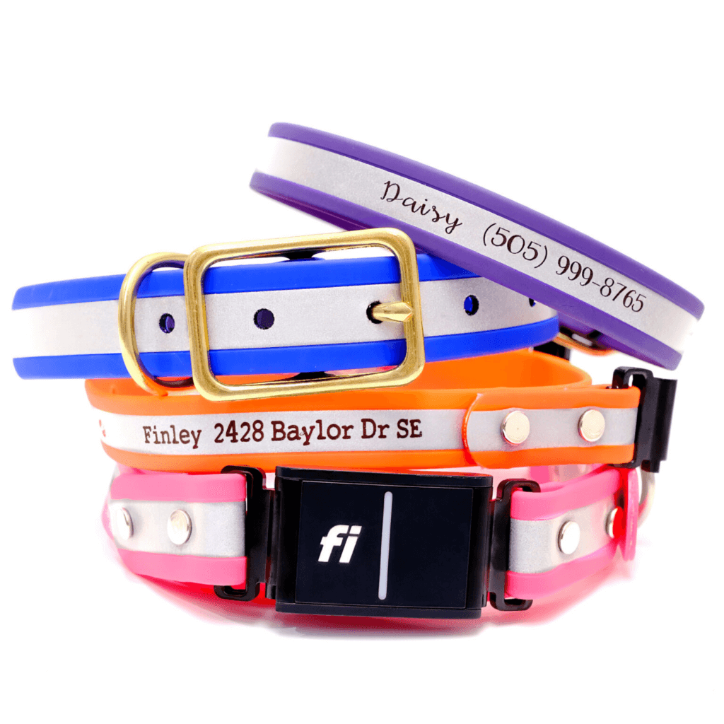 We have personalized options like the Fi Compatible Waterproof Engraved Reflective Dog Collar from the photo.