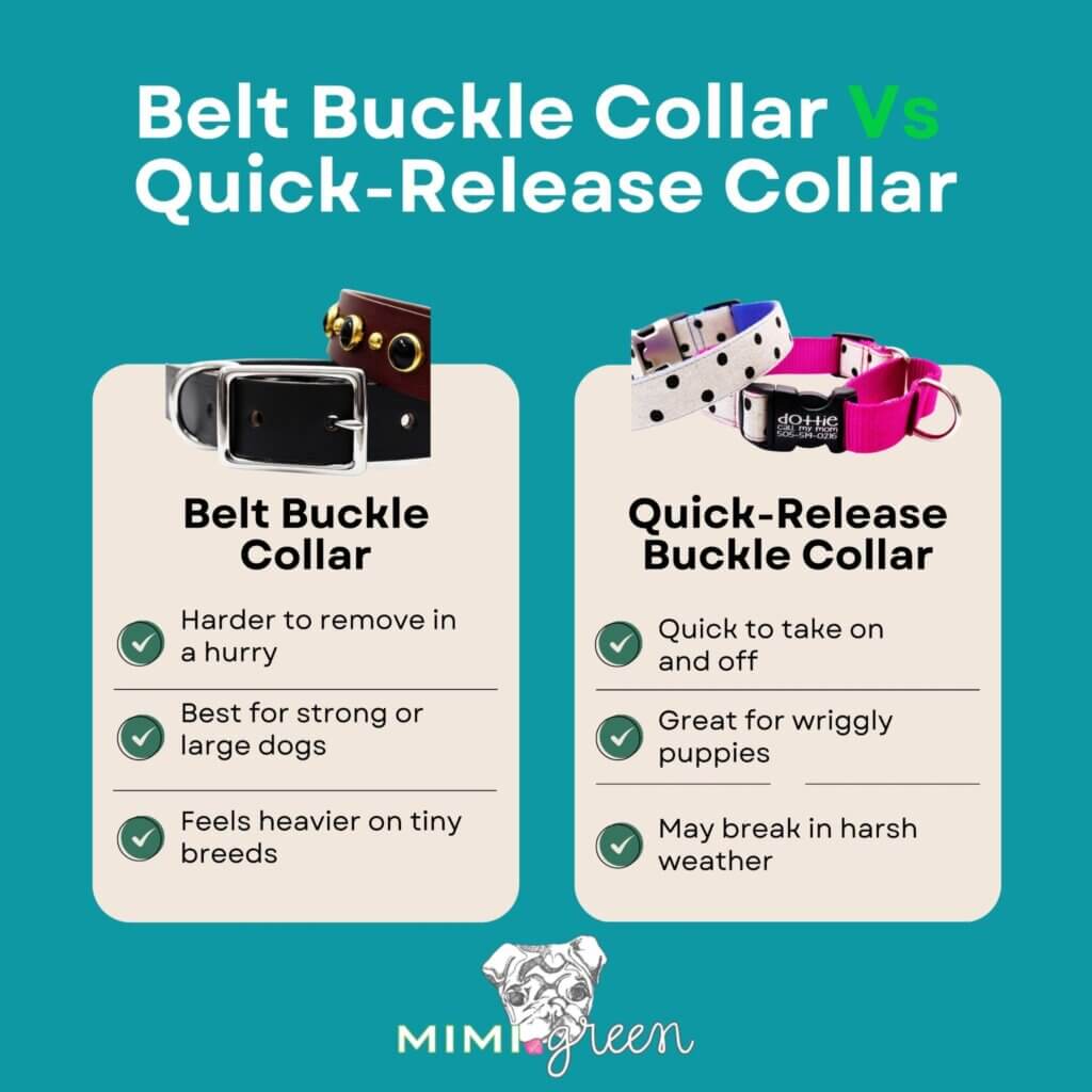 Belt-style buckles offer max security for strong pullers, while quick-release buckles (also called clips) are perfect for speed and convenience. Choose a buckle for durability and security; opt for clips for ease and daycare safety. The best collar depends on your dog’s size, habits, and environment.
