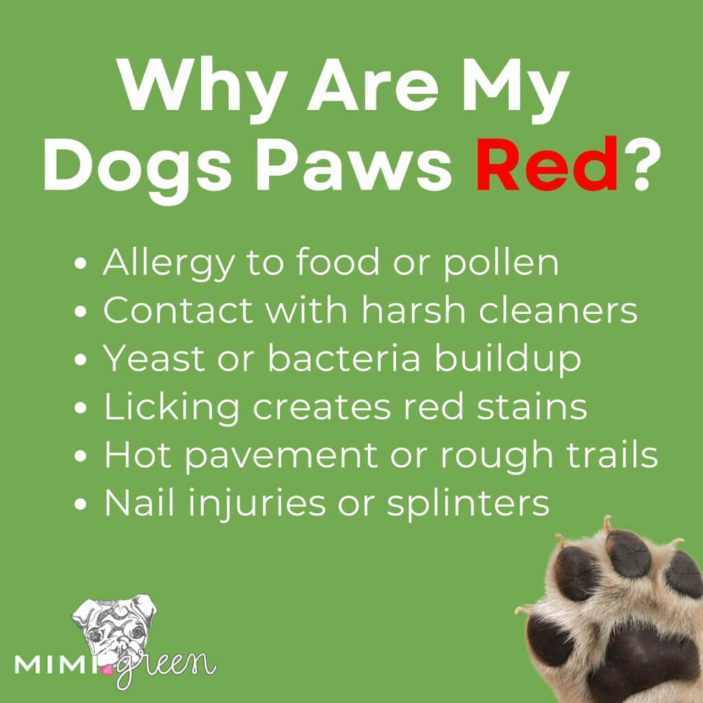 - Can food allergies cause red paws? Yes. In fact, paws are one of the first places food sensitivities show up. Common culprits include grains, chicken, and artificial preservatives. A limited-ingredient or grain-free diet can help reduce flare-ups.