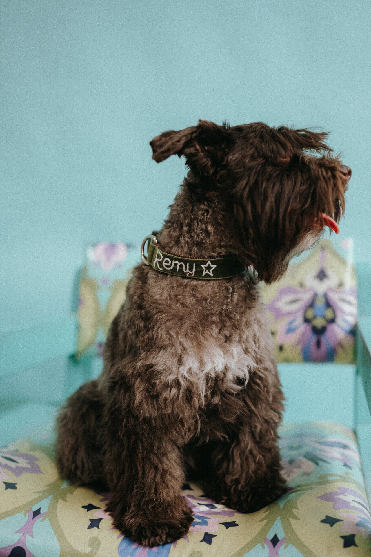 Just like our original collars, but with hand embroidered flair. Super luxe Green Velvet sewn atop Chocolate Brown nylon. Your little guy will not be camouflaged in this custom collar — we hand embroider your dog’s name right on this Swiss velvet collar.