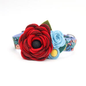 Our Mae collar corsage is made up of 3 beautiful felt florals. Made by hand in our studio, each corsage is a piece of original doggie couture.
