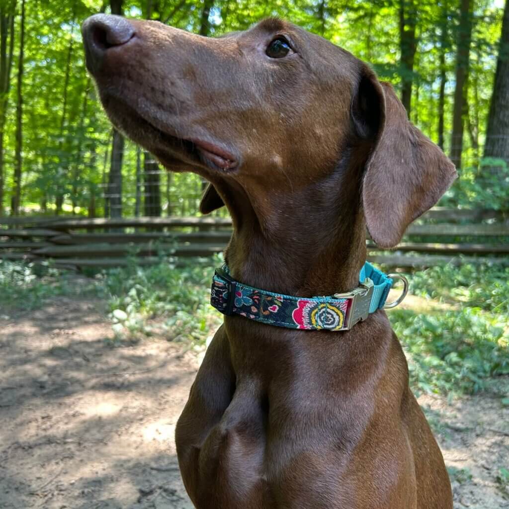 Our Midge Canvas Dog Collar is vintage cool. We love its 70s vibe and its vibrant colors. This collar is made from canvas which we love for its sturdy feeling and dirt resistance.