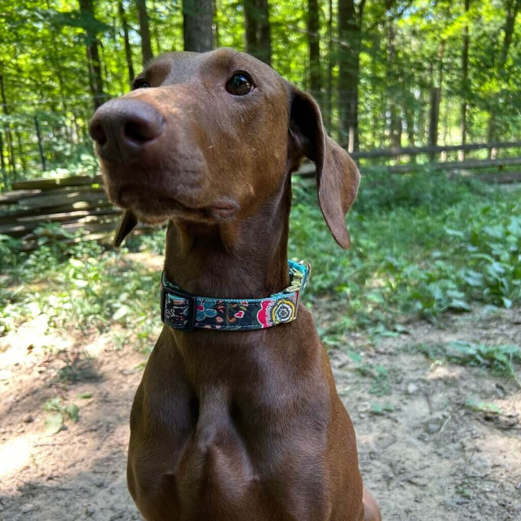 This collar is gorgeous, well crafted, and sturdy—all must haves for our Dobermann-Weimaraner cross.