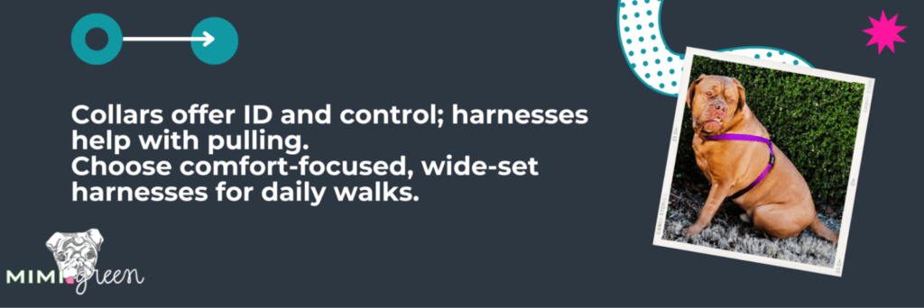 Some vets recommend harnesses for leash training, to prevent neck strain. But for day-to-day wear and quick outings, a collar is easier and more comfortable for many dogs.