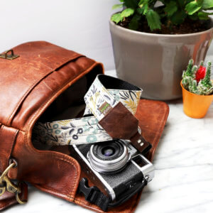 Rifle Paper Co. fabric is a work of botanical art. We love the simplicity of this pattern and small gold accents shimmering on this camera strap. It is fantastically beautiful & works great with DSLR cameras and mirrorless cameras alike!