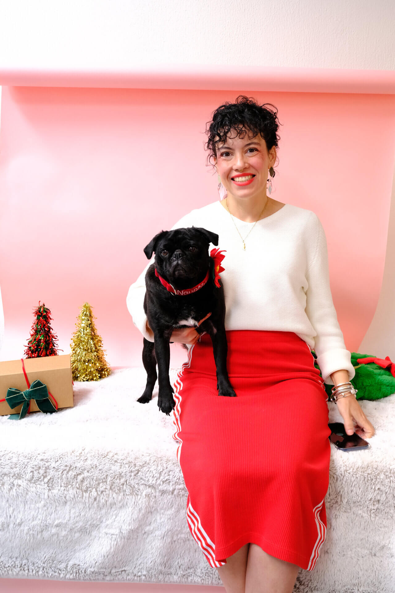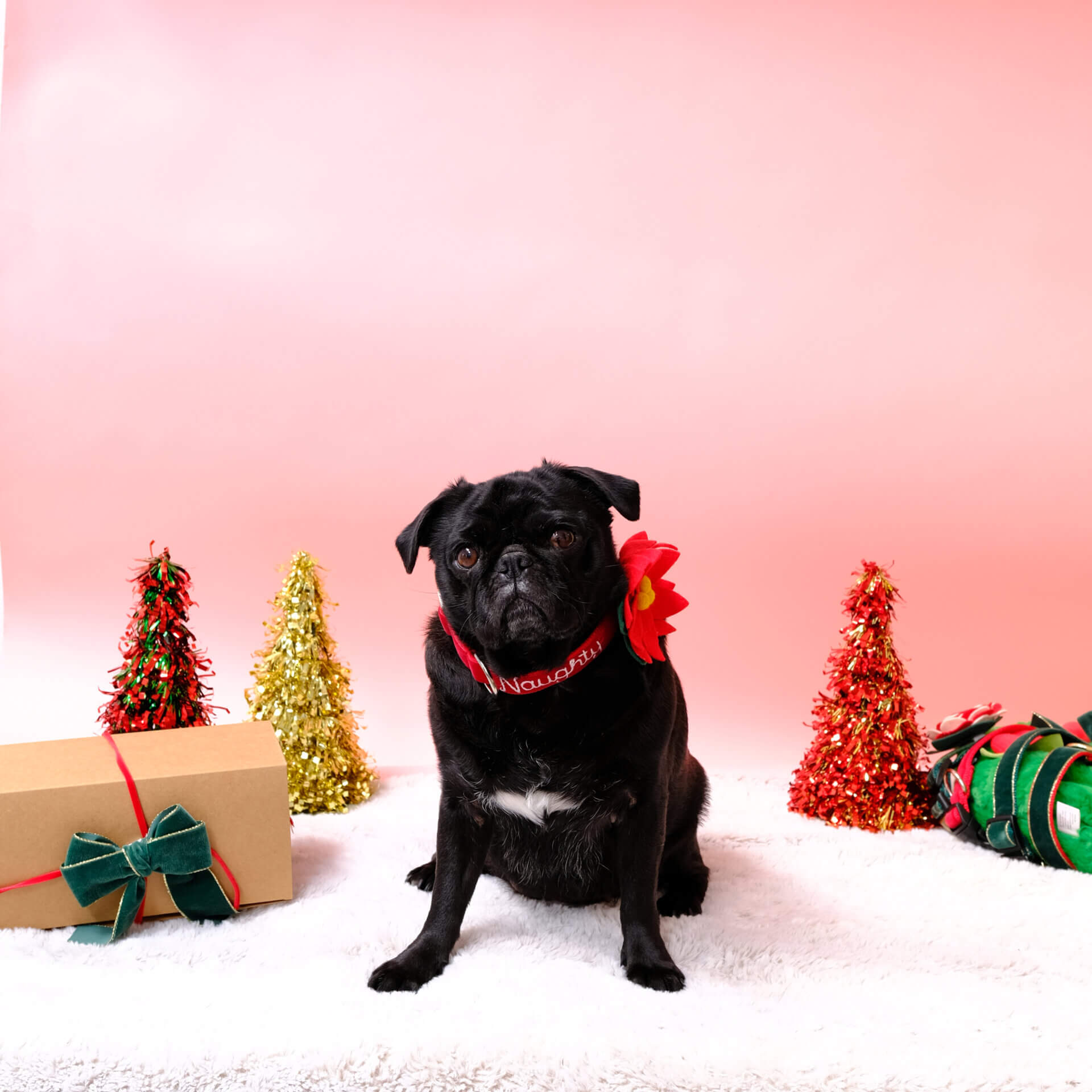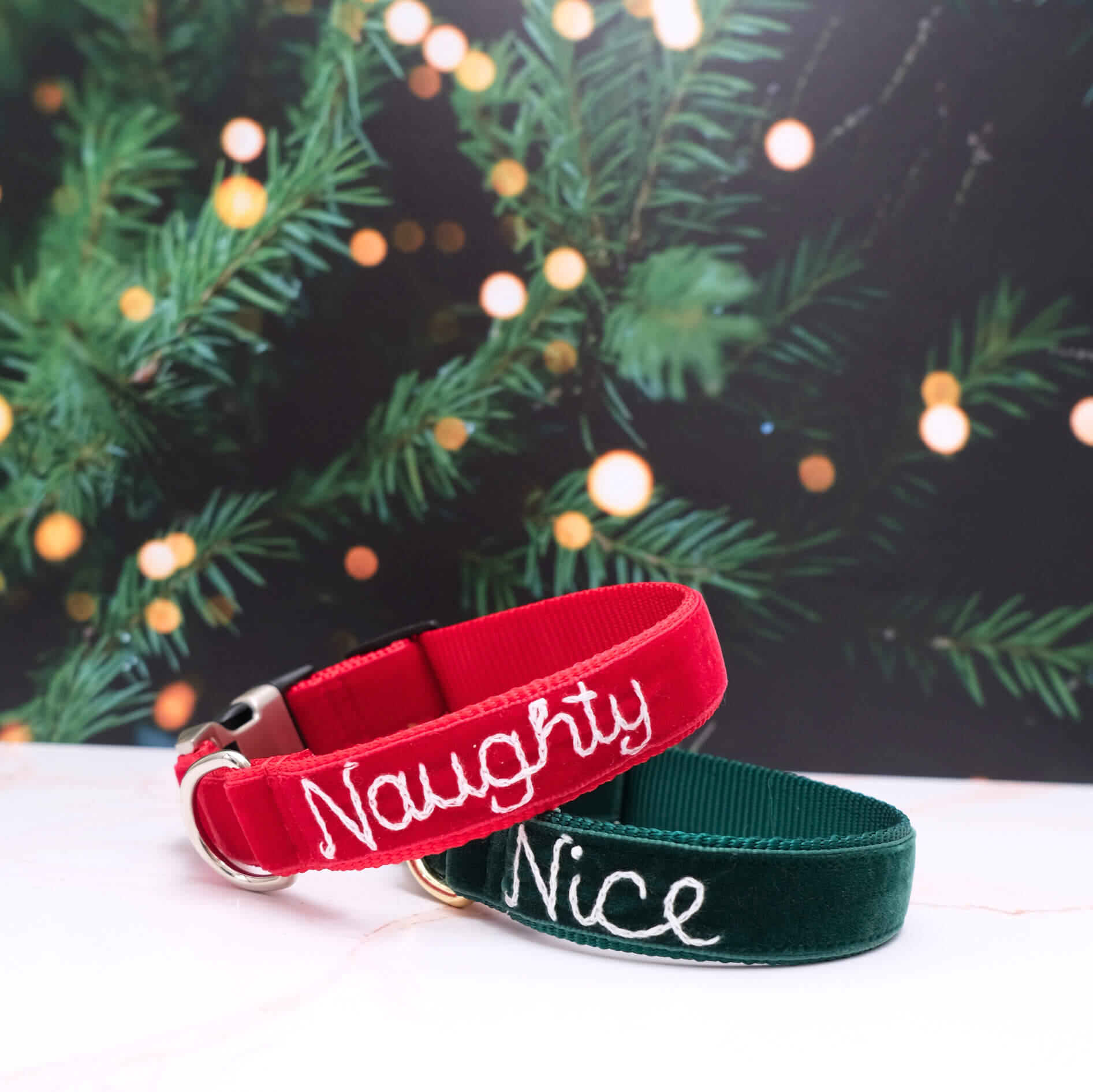 Each collar is handcrafted in our New Mexico studio using plush velvet ribbon, durable webbing, and sturdy hardware. Every stitch of “Naughty” or “Nice” is lovingly embroidered by hand — giving your dog a collar that’s as special as they are.