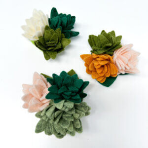 Inspired by our southwest home and love of plants, our dog collar succulent is made up of 3 beautiful felt succulents. Made by hand in our studio, each succulent accessory is a piece of original doggie couture. Choose the accent succulent color (Mustard, Enchanted Forest, or Moss), the dark green and pale pink stay the same.