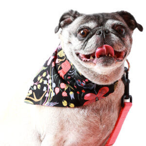 Model Penny is a sturdy little pug gal whose mom wants you to know has gone on a diet since this photo. She wears a medium collar and is wearing a medium bandana.
