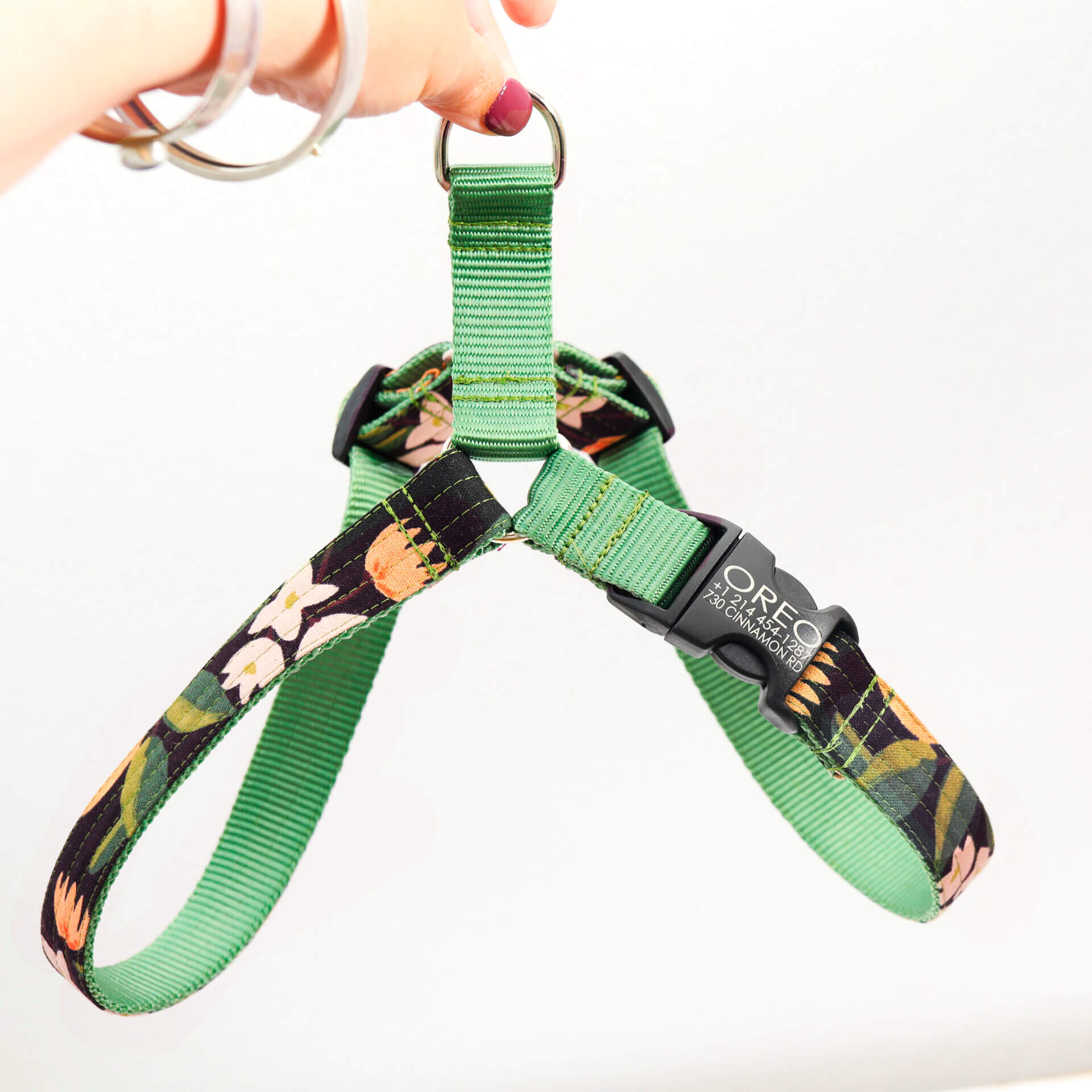 We don’t like bulky dog harnesses that take 15 minutes to put on, and we know you don’t either. We know your dog is ready for that walk 10 minutes ago! Who has time to stop to fuddle around with a harness? Mimi Green has the answer. We designed this harness to be super simple to use, without sacrificing safety or style. That’s right — all you have to do is slip the loop over your pups head and then fasten the buckle around their belly and you are ready to go! Couldn’t be easier OR better looking!