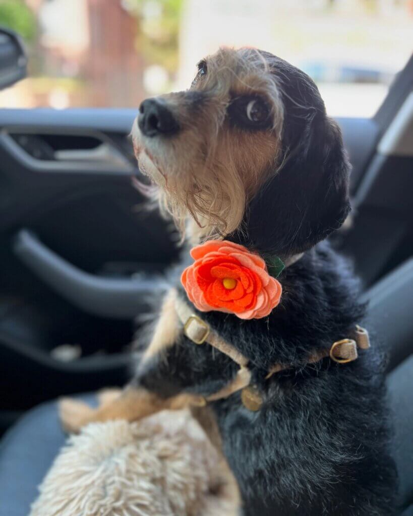 - Elastic ring wraps around collar to secure the flower to your dog’s collar and easily remove to wash