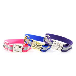 Our personalized reflective dog collar is made in the USA out of waterproof biothane webbing. Expect this collar to be strong, fashionable and long lasting. The webbing has a silver highly reflective strip built in to the collar for safety and night time protection.
