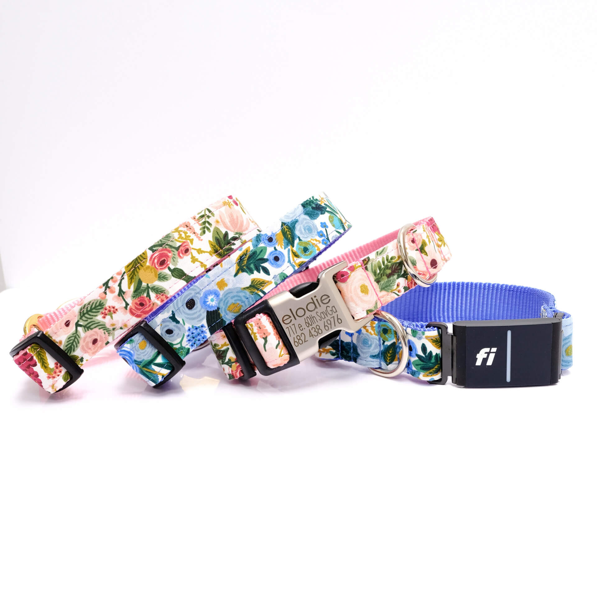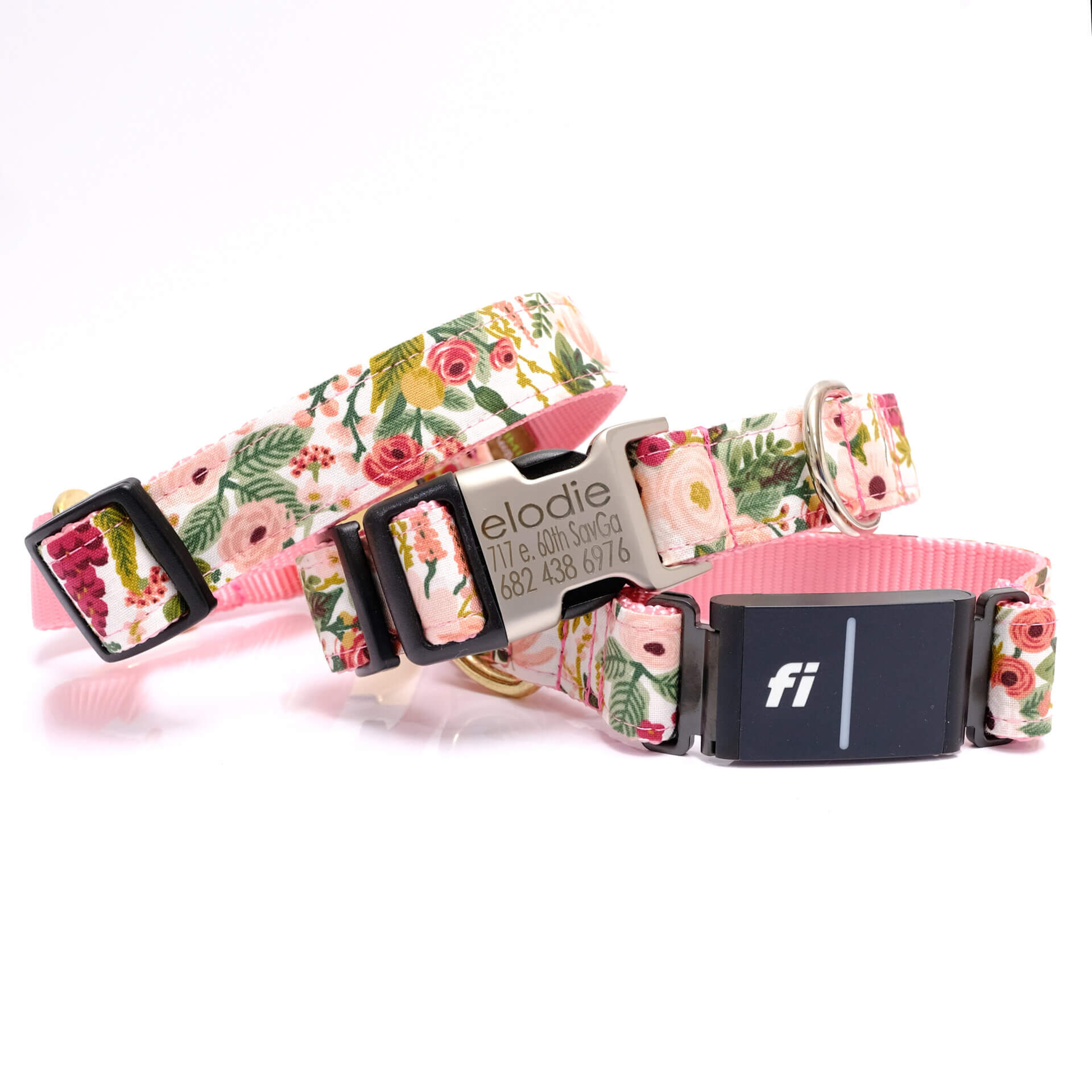 - Cheerful pink or blue floral Fi-compatible dog collar featuring fabric from Rifle Paper Co.