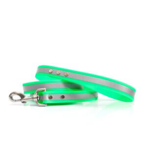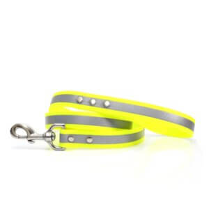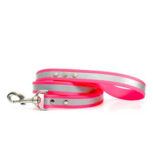 We just love this reflective waterproof and smell resistant dog leash. It is great for night time walks and can stand up to just about anything you can throw at it. (Minus chewing of course!)