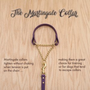 A martingale collar, or a no-slip collar, tightens when the dog pulls on it. This provides more control without harming the dog’s neck and throat.